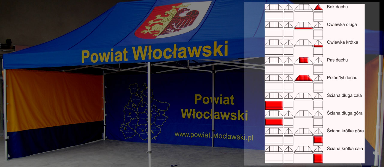 Namioty z nadrukiem to nowość na Polskim rynku. Jest to również jedna z najlepszych możliwości, jeśli chodzi o wyróżnienie się podczas wszelakich targów czy eventów. Druk jest bardzo trwały, oraz może zostać wykonany na każdym elemencie namiotu. Poniżej, na przykładzie siatki namiotu 3x6m przedstawiamy możliwość zadruku: